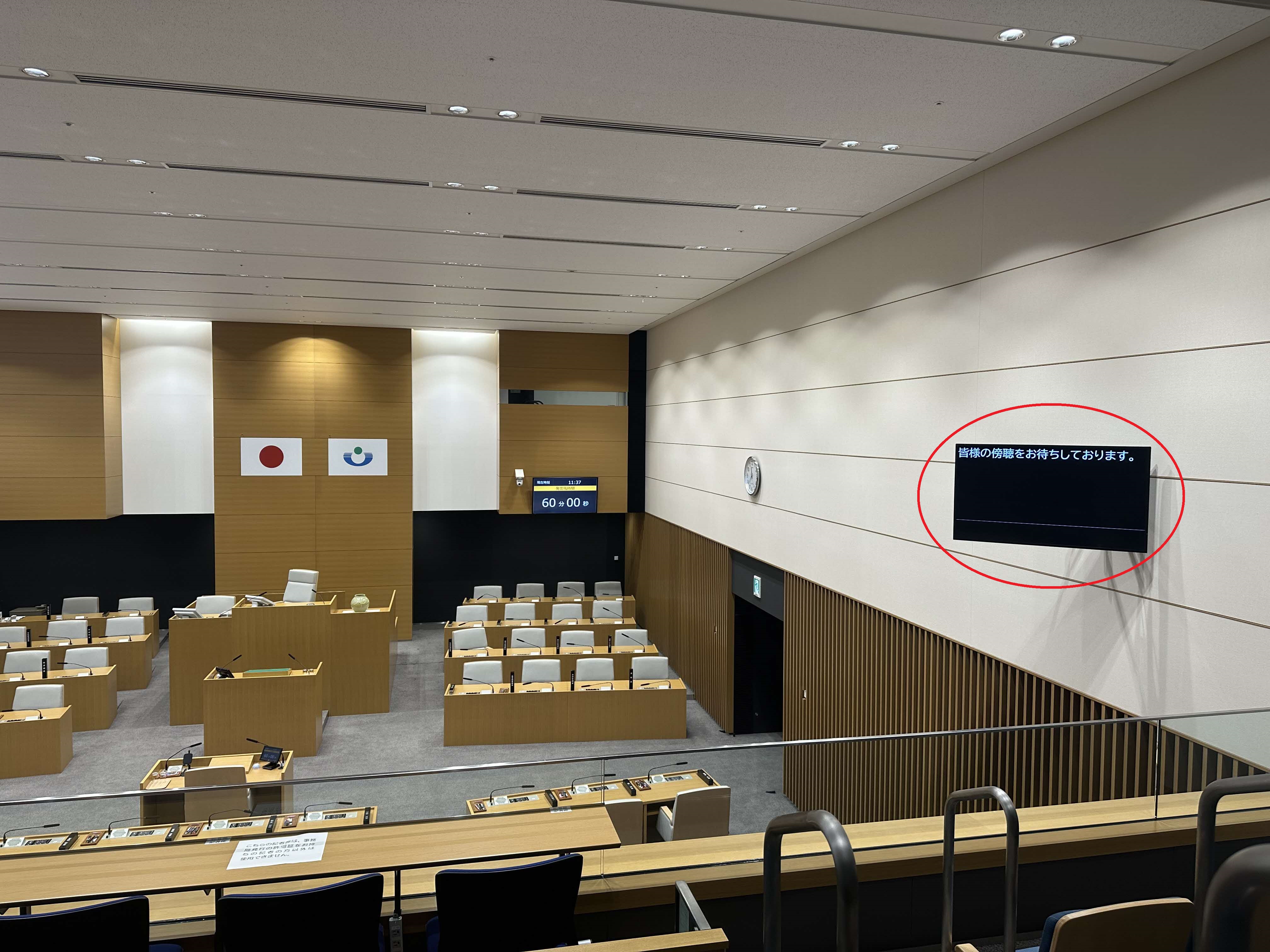 また、議場の傍聴席に字幕を表示するモニターを新たに設置しましたので、傍聴しながら、 字幕でも確認できます。